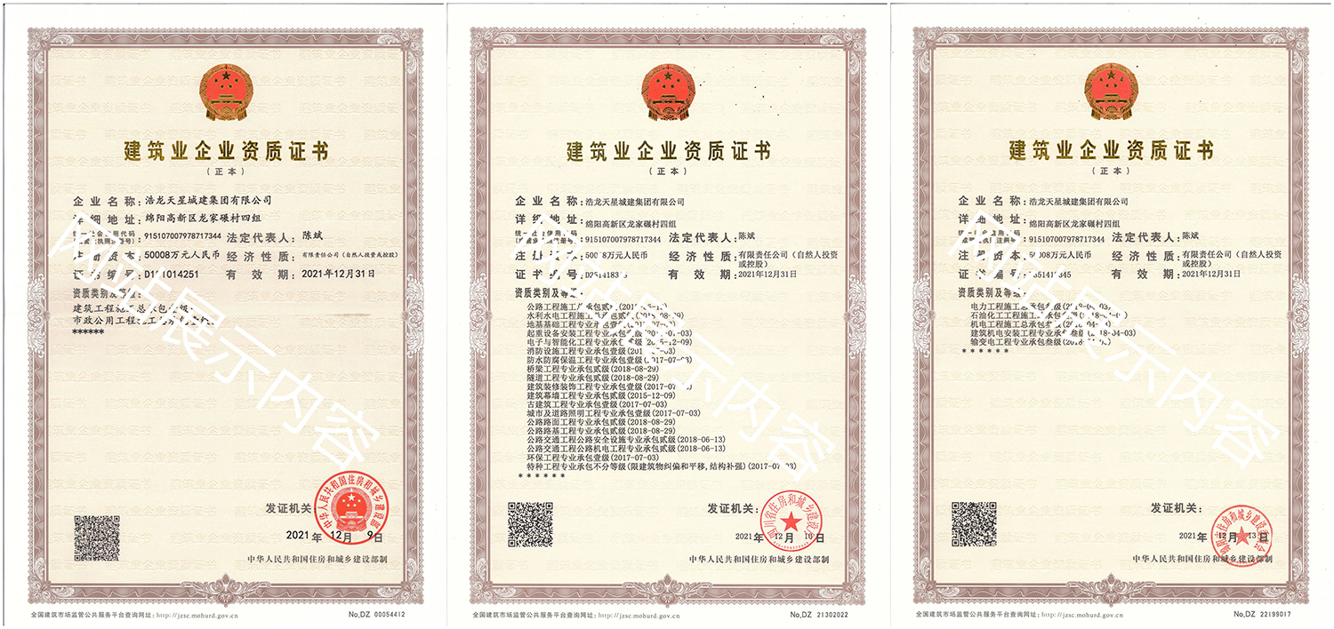 浩龍?zhí)煨浅墙瘓F(tuán)有限公司,2007年成立于“李白故鄉(xiāng)、中國(guó)科技城”—四川省綿陽市,企業(yè)注冊(cè)資本金5.0008億元。公司共有27項(xiàng)建筑業(yè)企業(yè)資質(zhì),其中國(guó)家一級(jí)資質(zhì)11項(xiàng),二級(jí)資質(zhì)10項(xiàng),三級(jí)資質(zhì)5項(xiàng),特種資質(zhì)不分等級(jí)1項(xiàng),類別涵蓋建筑、市政、水利、機(jī)電、隧道、起重設(shè)備安裝等基礎(chǔ)及未來發(fā)展重點(diǎn)專業(yè)。公司...